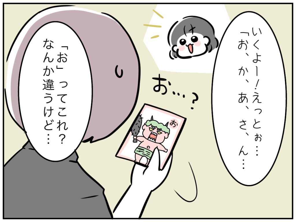 そして「お母さん」で鬼の絵札とった時は「お母さんは怒ると鬼になる」って文章になるのかと思ったわ。