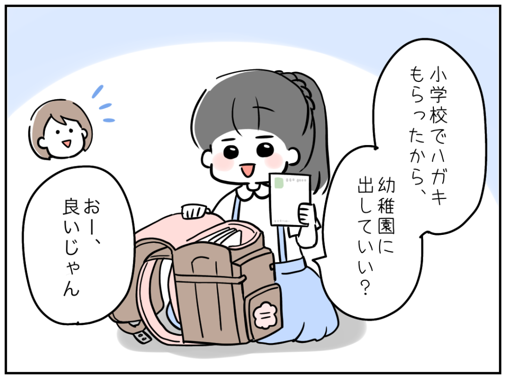 ハガキの隙間に小さい文字で、挨拶や小学校でハガキについて学んだ旨を書いときました。