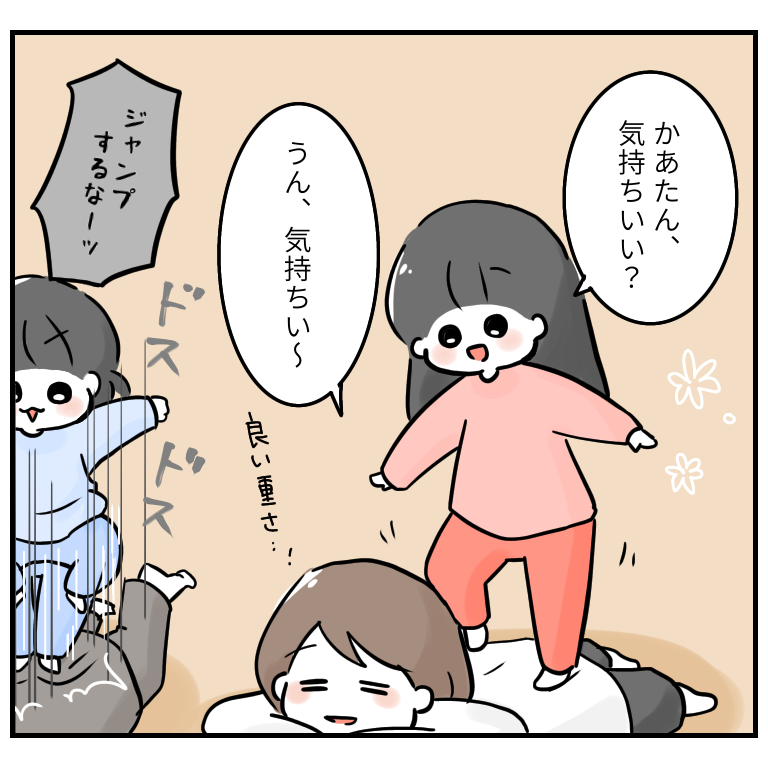 背中の上で大人しく足踏みしててくれたら丁度いい重さなんだけど、