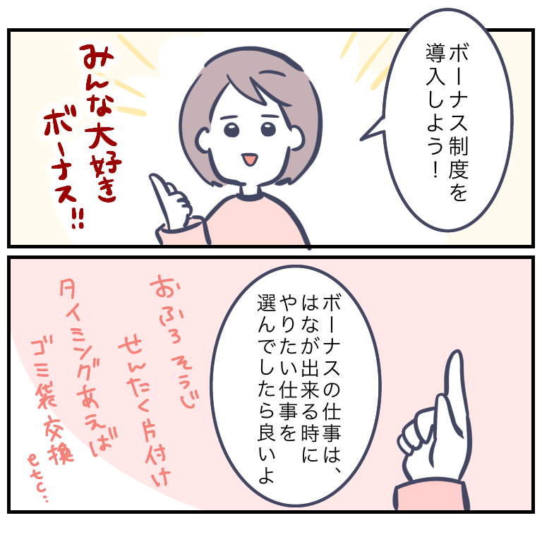 そして毎日じゃなくても良いから、たまにやってほしい仕事をボーナス制にしてみました。