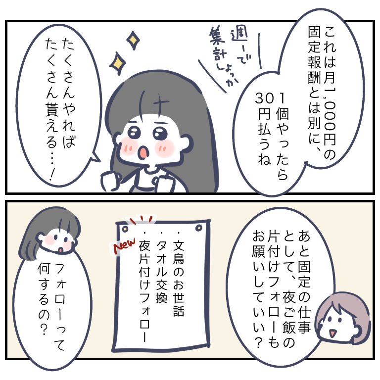 はなのお仕事は「文鳥のお世話」「タオルの交換」「夜ご飯の片付けフォロー」に決まりました。