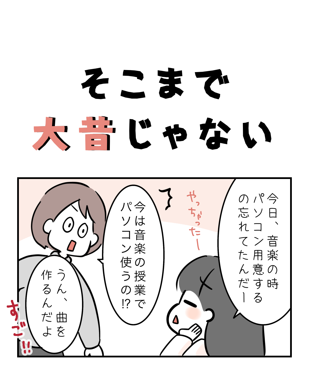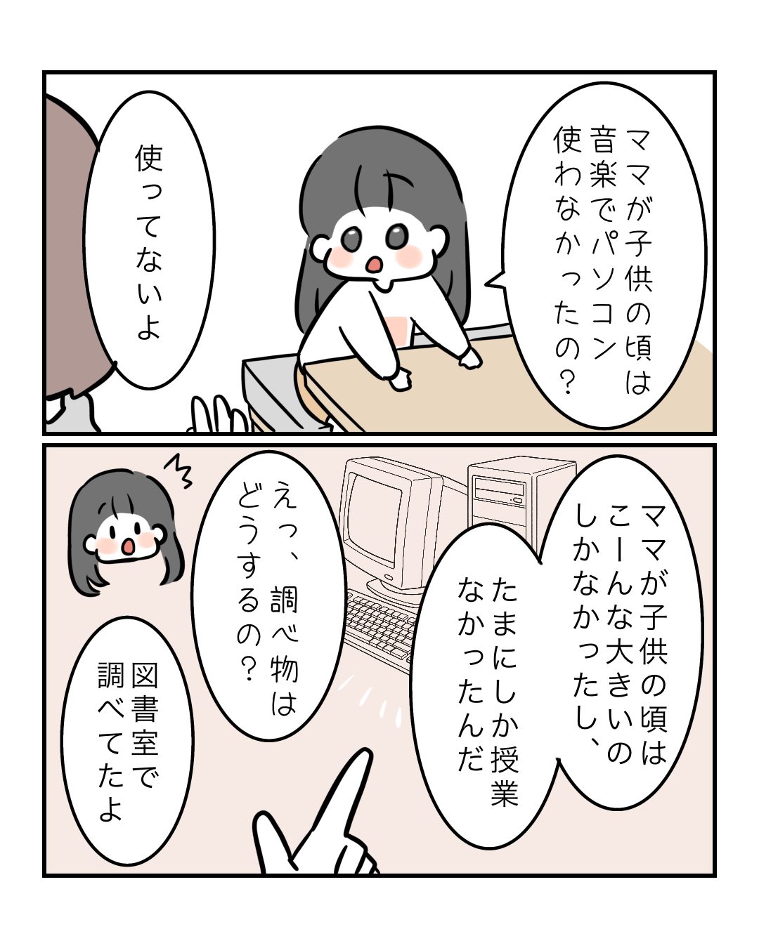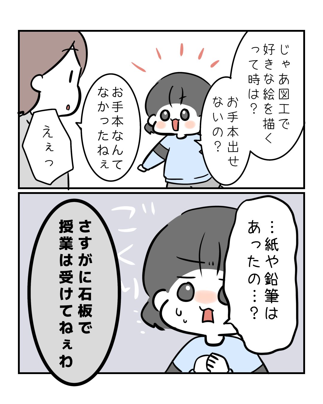 そこまで大昔じゃない2025.12.08小学校子育て, 子育て漫画, 小学校, 小学生, 育児, 育児漫画 そこまで大昔じゃない ちゃんと紙や鉛筆がある時代だよ!子どもたちの授業の様子聞くと自分の時と全然違って、令和だなぁって感じがする。パソコンっていろんな授業で活用してんだね…。すごいわ…! コメントはこちら 同じカテゴリの記事 お姉さんへの道は遠い 朝から絶叫する母 小1に恋はまだ早い そこまで大昔じゃない ちぎられた消しゴムの理由 放課後に現れる謎のおばさん 先生、〇〇をお願いします! よくある問題だと思いきや なつやすみ どこまでもいっしょ 小学生1年目って感じする 小学1年生が絶望する時 習字ファッション 入学して最初のミッション 制服ある?なし? 最終日に気づいちゃった 絵日記かけないな 使ってくれない運動会 全然なんでも良くなかった まさかのチョイス 確認しといて良かった夏休み 夏休み前の母の試練 給食は確かに重要だけど そう思っていた時期がありました 小学生には一大事 お迎えに行ってみたら 前の記事 11日間の夜間咳で爆発した話③ 2025.12.05次の記事 【完結済】子供の虫歯が〇〇いなんて知らなかった!①|再掲載 2025.12.09アプリなら通知ですぐ読める! NAPBIZブログ