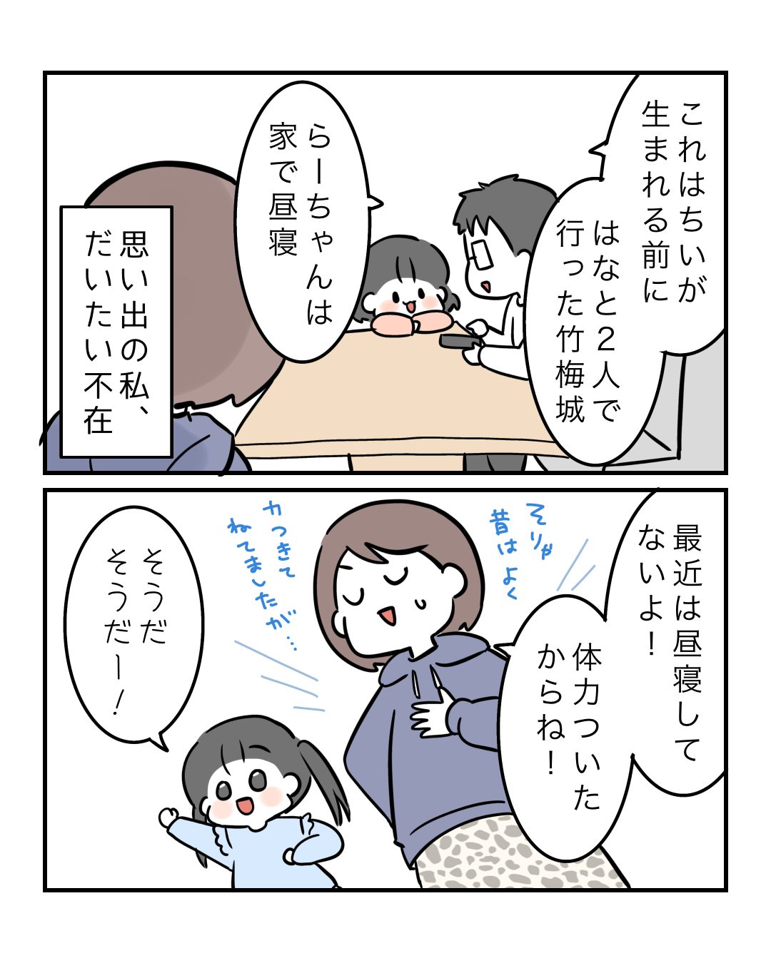 ちょっと昼寝してるうちに…2026.03.11健康アラフォー, ミドサー, 子育て, 子育て漫画, 育児, 育児漫画 ちょっと昼寝してるうちに… 3分なら…歩けるよ…運動しなさすぎて昼寝よくする人になってましたが、ここ数年でやっと復活しました!運動…大事だね…!! コメントはこちら 同じカテゴリの記事 ちょっと昼寝してるうちに… ママはそう思うのさ 旅行×生理回避のためピルを使ってみた話 後編 旅行×生理回避のためピルを使ってみた話 前編 正月太りの代償 お熱どこ行った? ボーナスタイムなのでは? 思ったよりガチだった 自然と抜けない子供の歯 おうちマッサージの悲劇 4歳女子だってダイエットがしたい! 前の記事 母を見送るまで知らなかった事① 2026.03.05次の記事 これだけは言っておく! 2026.03.16アプリなら通知ですぐ読める! NAPBIZブログ