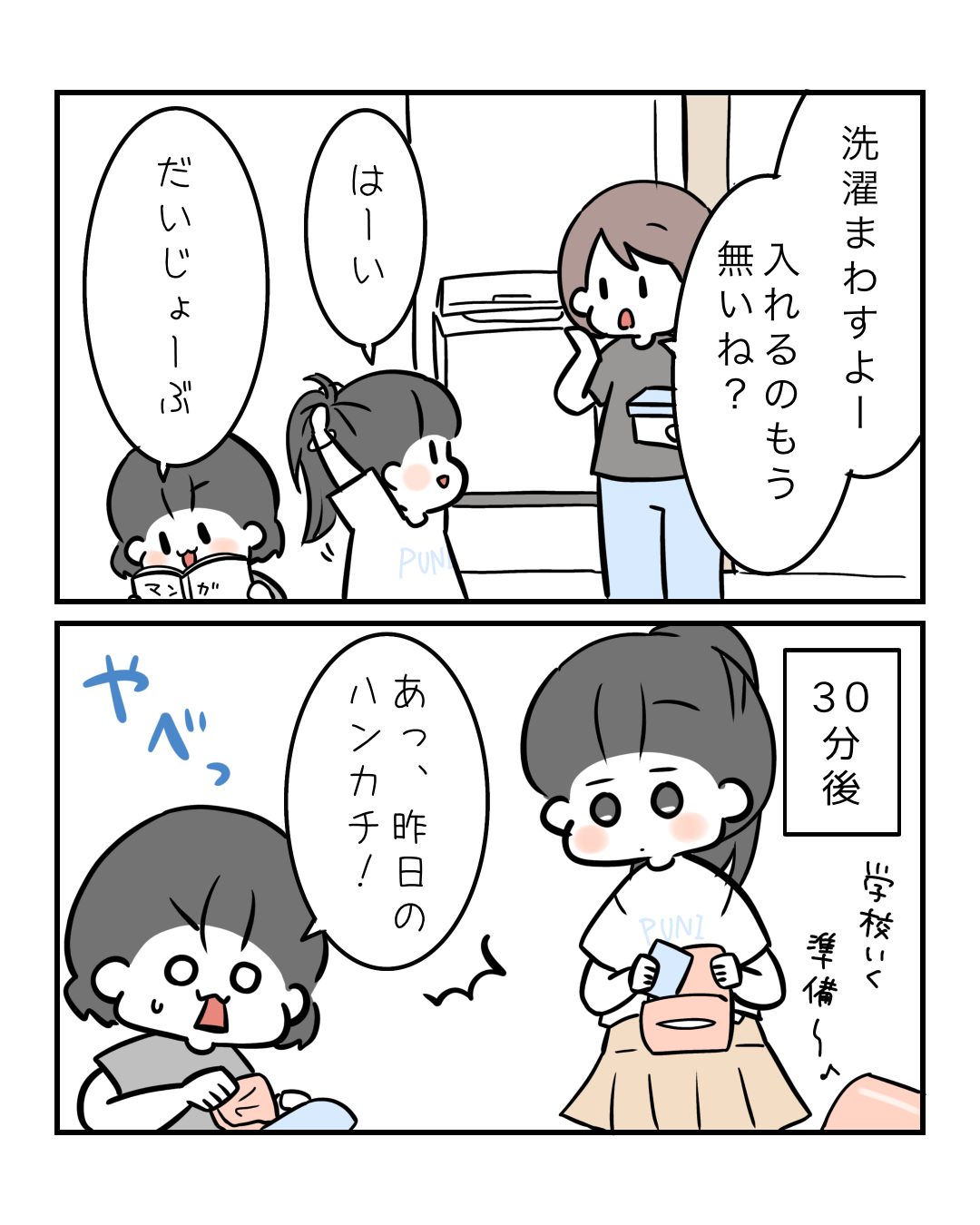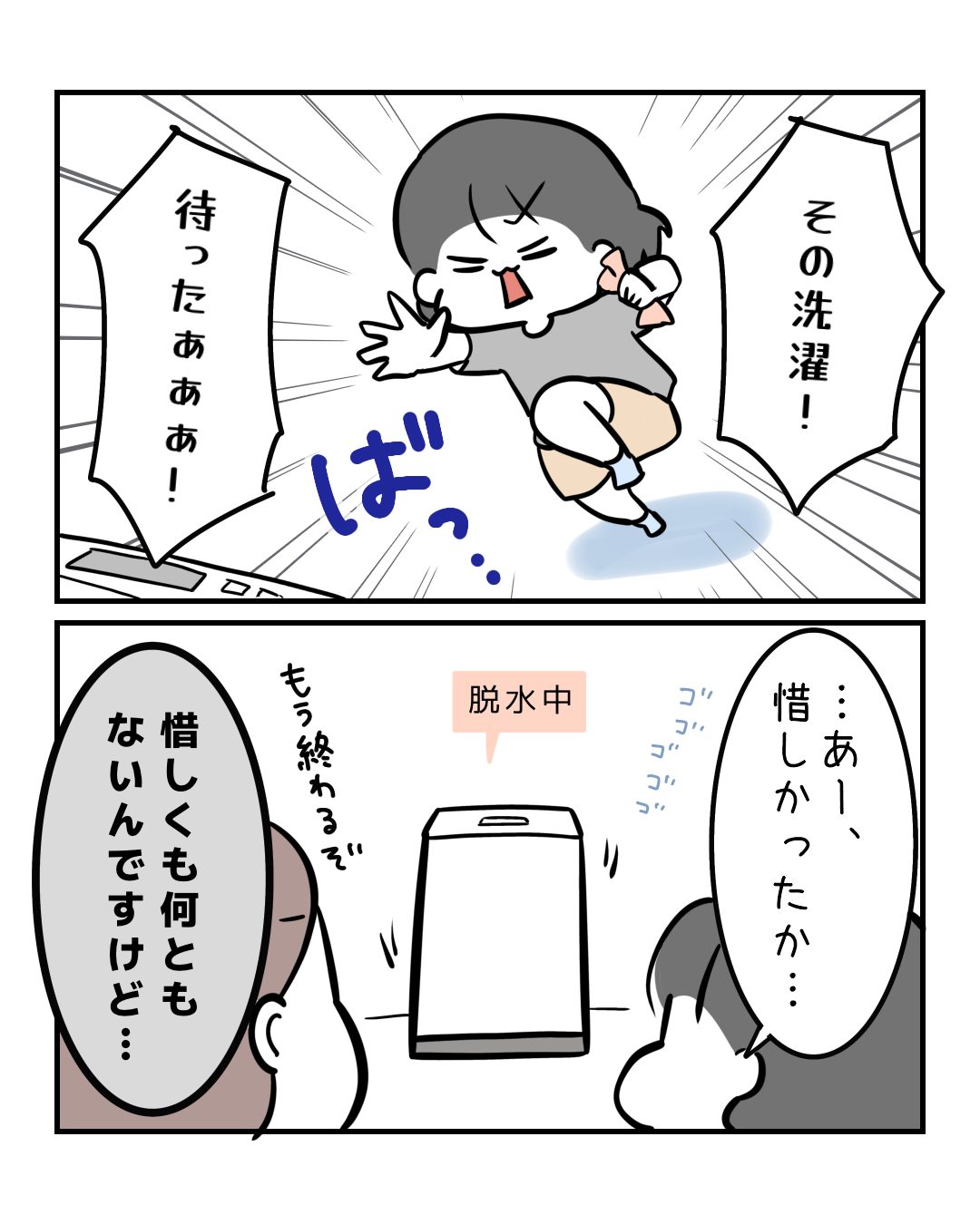 ギリギリでもなんでもないぞ2026.04.23小ネタ子育て, 子育て漫画, 小2, 育児, 育児漫画 ギリギリでもなんでもないぞ あと5分で終わるよ移動ポケットを使用してるからか、ハンカチの洗濯出し忘れよくあるぜ…!せめて「洗い」タイムに入れてくれ。 コメントはこちら 同じカテゴリの記事 ギリギリでもなんでもないぞ 悪口なのにほっこりした 9歳と7歳の合言葉チョイス これだけは言っておく! ぐんぐん伸びてくわ それこぼすと嫌だなぁ… 顔認証には勝ったけど… 聞いてた話と違うぞ? 効果はバツグンだ! こんなに儚いっけ? 年始からやらかす人 言い逃げしていくんじゃない 小1が一生懸命考えた策です お前、◯◯だったんか… そういう事にしておいた 中途半端に風呂準備すな 大人になりたくない理由 当たっていたのは… 中間はないのかい? つけられたらすごく嫌なもの 遠くに飛ばしたはずなのに 今その場面じゃないの 小3女子の納得セレクト 夏休みランチ事情 夏休みだけどエアコンが壊れた! 大体これでゴリ押しする 小3恥じらいの妹経由作戦 冗談の代償が重すぎる はじめてのおつかい 生産者の顔してる 無慈悲なちいちゃん 可愛いと言ってほしい 思ってたのとちょっと違う トイレが無い時ほどこうなる パパはお呼びじゃないの 忙しすぎる朝の女子たち しりからフレグランス 最近じゃないの?? ママ立ち入り禁止 何度か諦めかけた 君が言い出したのよ 信用がないようだ エモさが勝るよね お母さんの言う通り 2024年まとめ 気を使うウサギ よく見てるわ 姉にそっくりだわ もれなく起こされる 伸び代あったわ ママのここが好き 我が家のパンツ名 やる気がありすぎる なんか静かだと思ったら 受け止める勇気がない ママにはよくわかんない 次女は学習した! お空にいた時の話 ただ切っただけなのよ… もう5歳なんだから これ絶対に縮んでるよね おしゃれには程遠い なんて過酷なゲーム 姉であって○○ではない 楽になる日を信じてる さては決まってるな? 着替えてない時に限って 雷の音と次女5歳 こんなとこまで似てる すごい勢いでやってきた ラップの芯とかレアアイテム 絵面は悪いけど全力で洗ったよ 5歳から考える婚活 母が溶ける前に返して ときめきを想像してたら 動きたくないとか関係ない 来てくれると思ってた いつの間にか3姉妹のパパ 30秒で後悔した あなたがいないとねむれない 女の子あるある 女の子ないない トイレに行ったその後に 冬定番の罠 4歳のクイズ その3択? 次女、人間じゃない説 1ページ漫画まとめ 母のライフはゼロよ…! 時よ止まれと願わずにはいられない 柔らかいんじゃなくて とうたんの正体 かわいいお手伝い お持ち帰り不要です パン作りとおしり 前の記事 母を見送るまで知らなかった事⑦ 2026.04.22次の記事記事がありませんアプリなら通知ですぐ読める! NAPBIZブログ