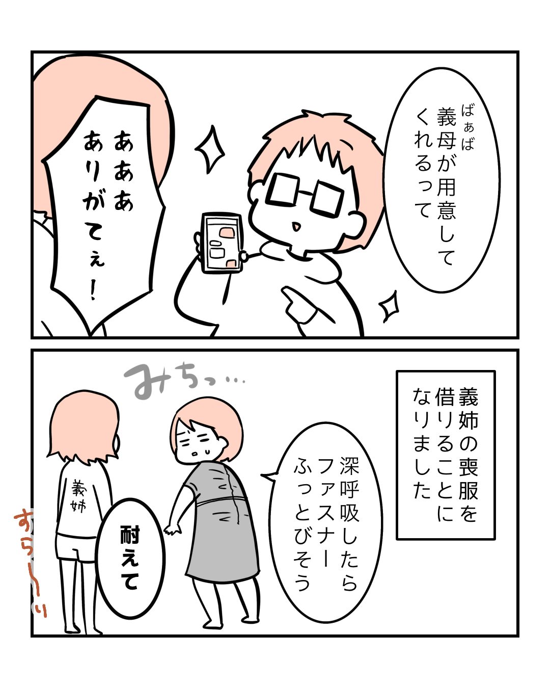 でも義姉すごい細い人だから、動くだけで服割けるんじゃないかってくらいピチピチだった…。