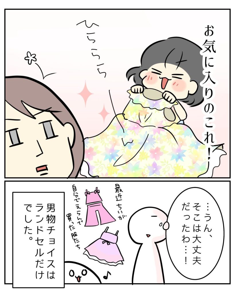 って一瞬心配したんだけど、ちいが「これ買ってー」って持ってくる服は、大体がひらふわな女子服だったので「それはそれ、これはこれ!!」って感じでした。