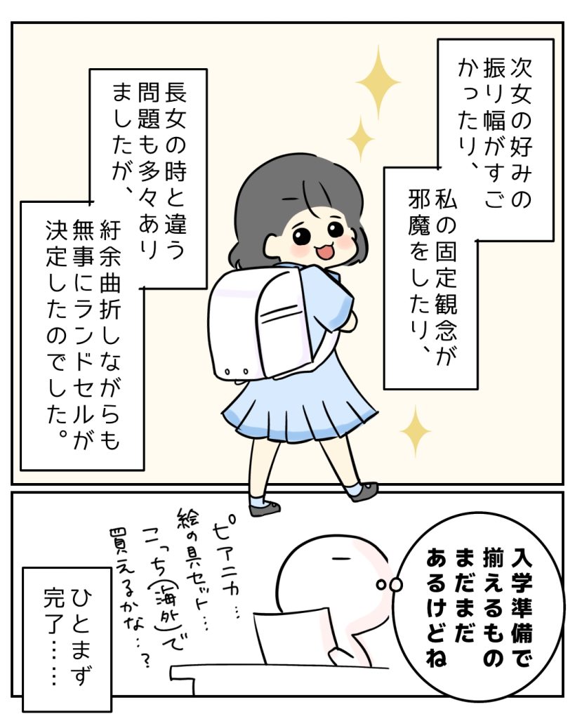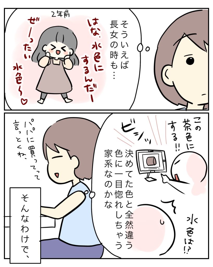 うちの姉妹は、決めてた色と大きく変わって、2人とも一目惚れでランドセル決定したよ。