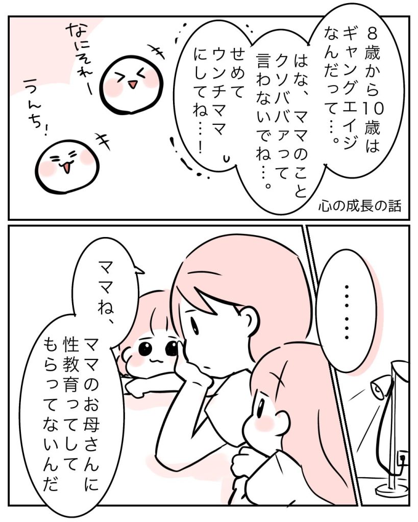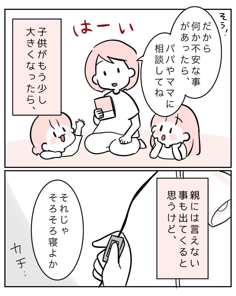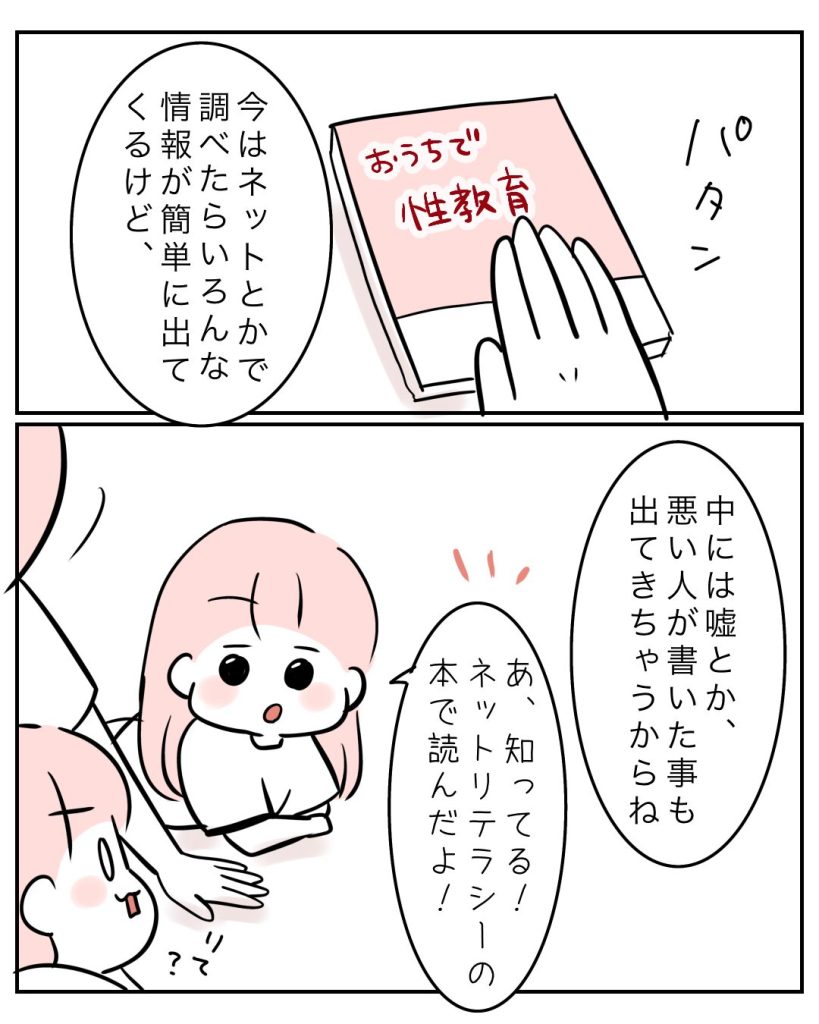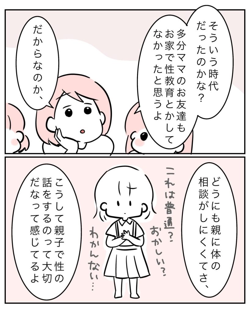 おうち性教育をすることで、体や心なんかの不安な事を親に相談しやすくなったんじゃないかなーと思います。