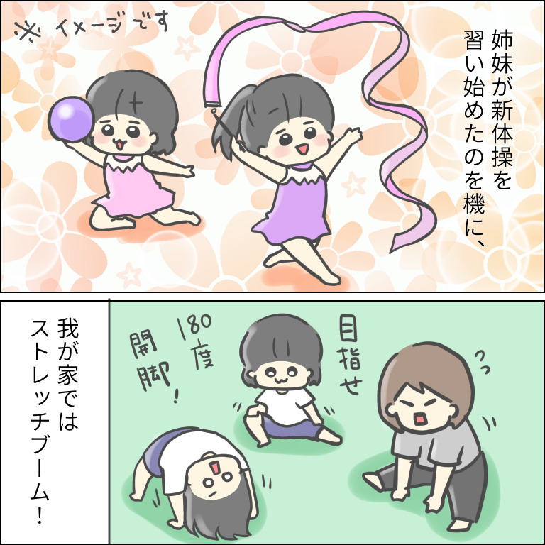 子どもたちは新体操レッスンに向けて、大人たちはガチガチに固まった体をほぐすために毎晩ストレッチをしています。